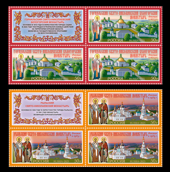 Россия 2025 год. Серия «Монастыри Русской православной церкви». Горнальский Свято-Николаевский Белогорский мужской монастырь. Рыльский Свято-Николаевский мужской монастырь, 2 квартблока с купоном (ном. 50 р.)