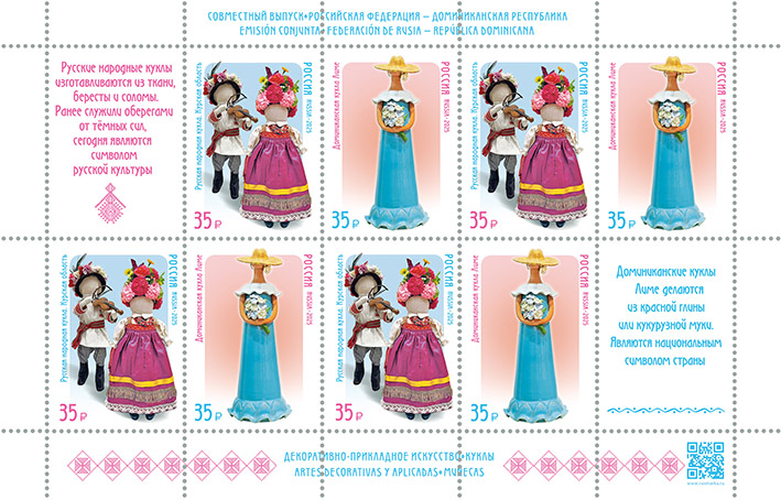 Россия 2025 год. Совместный выпуск Российской Федерации и Доминиканской Республики. К 80-летию установления дипломатических отношений. Декоративно-прикладное искусство. Куклы, лист (ном. 35 р.)
