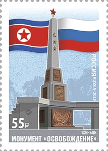 На почтовой марке изображены монумент «Освобождение» в Пхеньяне, посвящённый советским солдатам и офицерам, погибшим в боях на Корейском полуострове в августе 1945 года, и государственные флаги Корейской Народно-Демократической Республики и Российской Федерации.