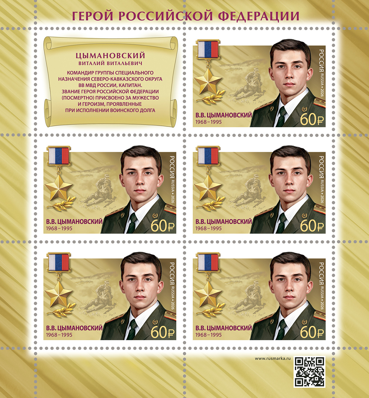 Россия 2026 год. Серия «Герои Российской Федерации». Ю.Д. Шадура (1961–1999), В.В. Цымановский (1968–1995), 2 листа из 5 марок и 2 купонов (ном. 600₽)