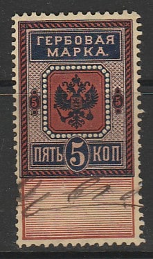 Российская Империя 1887-1890 год. Гербовая марка, ном. 5 коп. (гашёная) (I)
