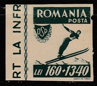 Румыния 1946 год. Спорт. Прыжки с трамплина, 1 б/зубц. марка из серии (наклейка)