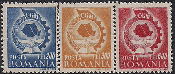 Румыния 1947 год. Конгресс Объединённых Профсоюзов. 3 марки с наклейкой