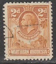 Северная Родезия 1925 год. Стандарт. Король Георг V в овале. Слоны и жираф, ном. 2 Р, 1 марка из серии (гашёная)