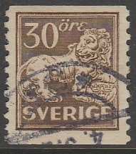 Швеция 1920 год. Стандарт. Лев с гербом, ном. 30 эре, 1 марка из серии (гашёная) С вертикальной перфорацией. (1 из 12) (0,7/0,5)