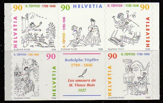 Швейцария 1999 год. 200 лет со дня рождения изобретателя комиксов Родольфа Тёпфера, 5 марок с купоном (самоклейка)