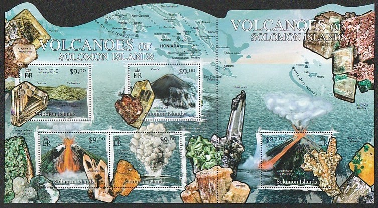 Соломоновы острова 2012 год. Вулканы и минералы, малый лист + блок (сцепка)