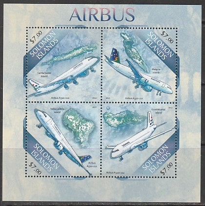 Соломоновы острова 2013 год. авиалайнер Airbus A320 "Дух Соломоновых островов" Н4-SIB, малый лист.