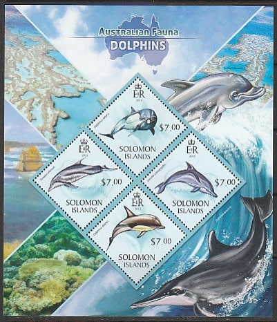 Соломоновы острова 2013 год. Австралийская фауна. Дельфины, малый лист.