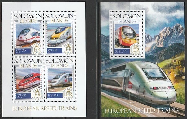 Соломоновы острова 2014 год. Европейские высокоскоростные поезда, малый лист + блок.