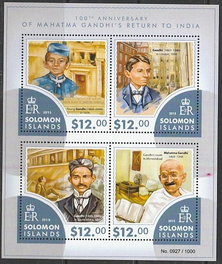 Соломоновы острова 2015 год. Индийский политик Махатма Ганди, малый лист.