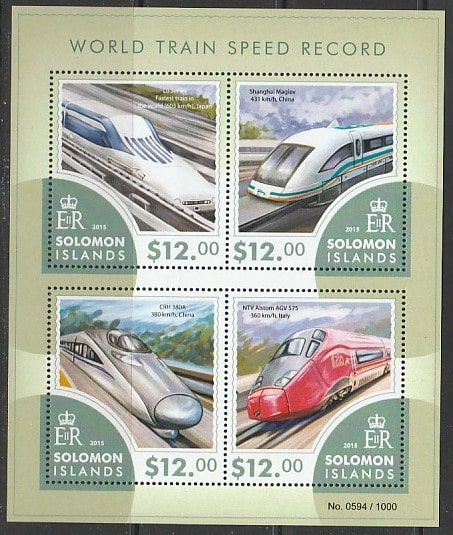 Соломоновы острова 2015 год. Высокоскоростные поезда разных стран, малый лист.