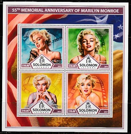 Соломоновы острова 2017 год. Американская киноактриса, певица Мэрилин Монро, малый лист.