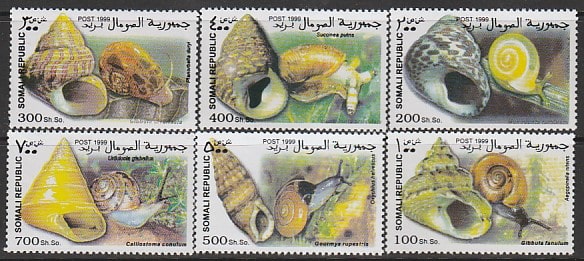 Сомали 1999 год. Улитки, 6 марок. Сувенирный выпуск.