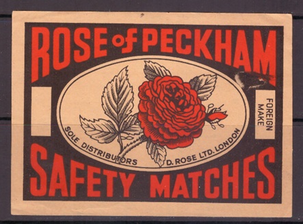 Спичечная гросс этикетка, иностранная. Англия. Роза Пэкхема. Безопасные спички. Сделано в Лондоне, 1 штука