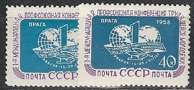 СССР 1958 год, Разновидность. Конференция молодежи, Лишний Остров, 1 марка (слева от материков ПЯТНА НА МАРКЕ