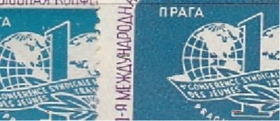 СССР 1958 год, Разновидность. Конференция молодежи, Лишний Остров, 1 марка (слева от материков ПЯТНА НА МАРКЕЛевая марка для образца
