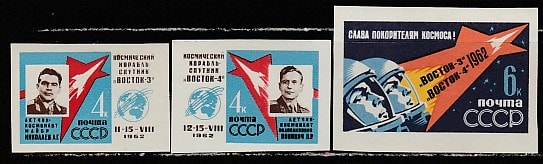 СССР 1962 год. Первый в мире групповой космический полёт, 3 беззубцовые марки