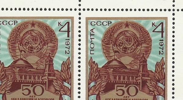 СССР 1972 г, Разновидность. 50 лет СССР, "Рваный" Флаг, 1-я марка, квартблок