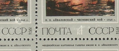 СССР 1974, Айвазовский, "Чесменский Бой", 1-я марка на Тексте Белое Пятно, квартблок