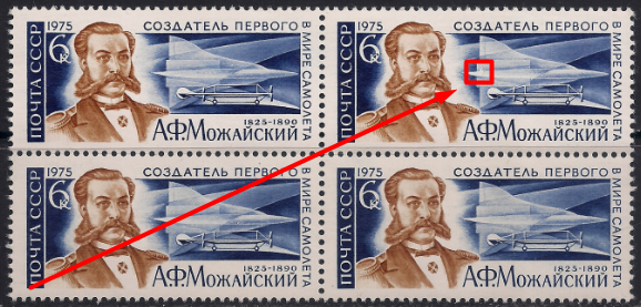 СССР 1975 год. 150 лет со дня рождения А.Ф. Можайского. Квартблок. Разновидность - белое пятно на хвосте самолёта