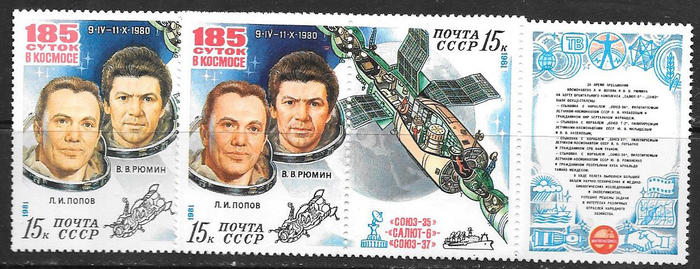 СССР 1981 год. 185 суток в космосе. Разновидность - красный и розовый текст, разный оттенок лиц