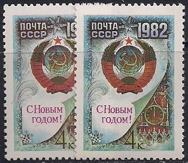 СССР 1981 год. С Новым 1882 годом! (5181). Разновидность - темный синий цвет правой марки (Ю)