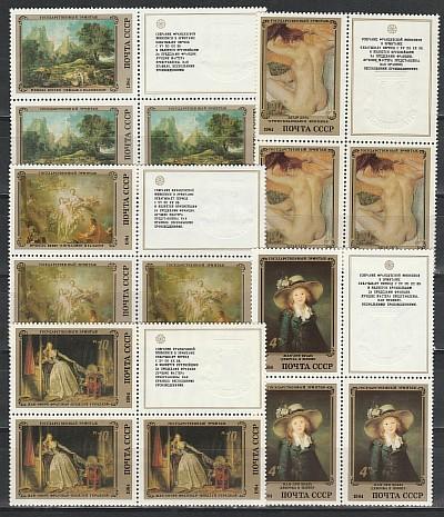 СССР 1984 г, Эрмитаж, Французская Живопись, 5 квартблоков с верхними правыми купонами