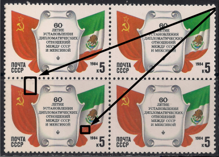 СССР 1984 год. 60 лет дипломатическим отношениям между СССР и Мексикой. Квартблок. Разновидность - красная полоса над флагом СССР + точка на флаге Мексики