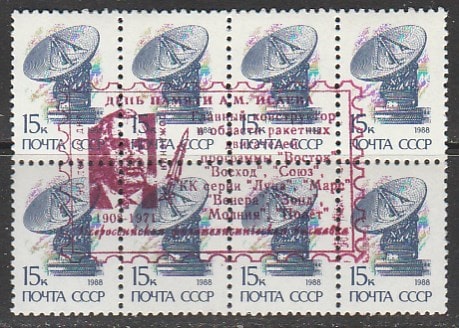 СССР 1988 год. Стандарт (ном. 15 к.). НДП: "Всероссийская филвыставка. День памяти А.М. Исаева - главного конструктора в области ракетных двигателей", 8 марок.