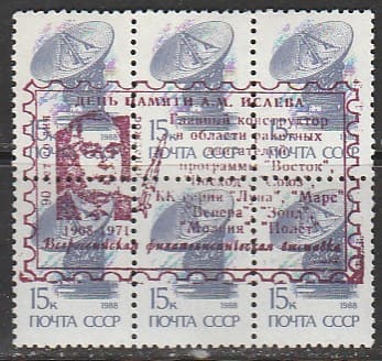СССР 1988 год. Стандарт (ном. 15 к.). НДП: "Всероссийская филвыставка. День памяти А.М. Исаева - главного конструктора в области ракетных двигателей", 6 марок