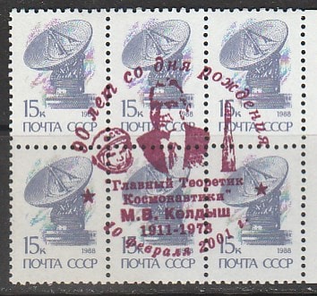 СССР 1988 год. Стандарт (ном. 15 к.) СГ: 90 лет со дня рождения теоретика космонавтики М.В. Келдыша, 10.02.2001 год, 6 марок (красная)