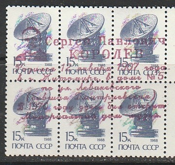 СССР 1988 год. Стандарт (ном. 15к.). НДП: "С.П. Королёв. Родился 12.01.1907 года в Житомире в доме № 5 по ул. Леваневского. В 1970 году открыт Мемориальный дом-музей", 6 марок.
