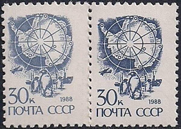 СССР 1989. 1988 год. Стандарт. Антарктика. Простая бумага (6089). Разновидность - светлая марка слева, тёмная - справа