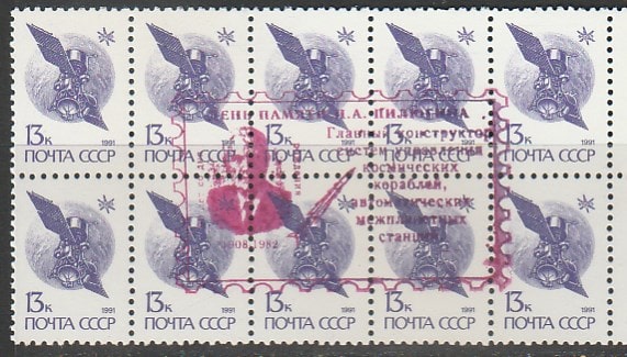 СССР 1991 год. Стандарт (ном. 13 к.). НДП: "День памяти Н.А. Пилюгина, главного конструктора систем управления КК и АМС", 10 марок.