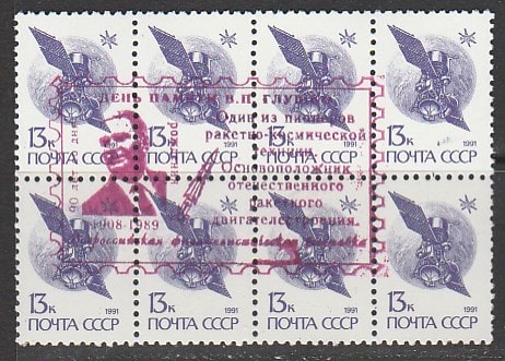 СССР 1991 год. Стандарт (ном. 13 к.). НДП: "Всероссийская филвыставка. День памяти В.П. Глушко. Один из пионеров ракетно-космической техники", 8 марок.