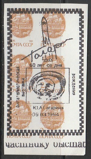 СССР 1991 год. Стандарт (ном. 2 к.) НДП: "Филвыставка. 60 лет со дня рождения Ю.А. Гагарина, 09.03.1994 год", 6 марок.