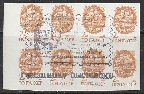 СССР 1991 год. Стандарт (ном. 2 к.). НДП: "Всероссийская филвыставка. День памяти А.М. Исаева - главного конструктора в области ракетных двигателей", 8 марок.