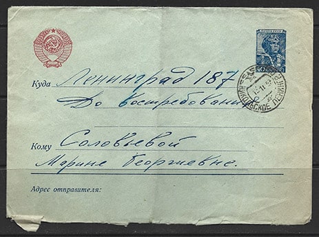 Стандартный конверт прошел почту 1953 год, марка № 1386 40 копеек