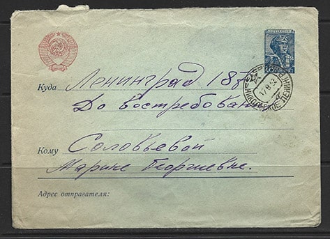 Стандартный конверт прошел почту 1953 год, марка № 1386 40 копеек