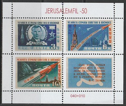 Сувенирный листок. Юбилейная 50-я встреча коллекционеров "Jerusalemfil-50" в Иерусалиме. Космос, 3 марки с купоном, сентябрь 2011 год (I)