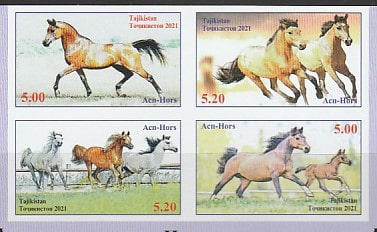 Таджикистан 2021 год. Лошади, б/зубц. квартблок (н