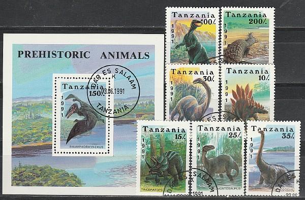 Танзания 1991 год, Динозавры, 7 гашеных марок + блок .