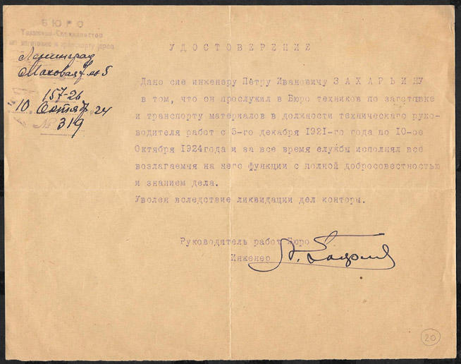 Удостоверение. Бюро техников специалистов по заготовке и транспорту дров, 1924 год