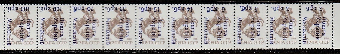 Украина 1993 год. Провизории. Николаев. Локальный выпуск, полоса из 10 марок (перевёртка) (II)