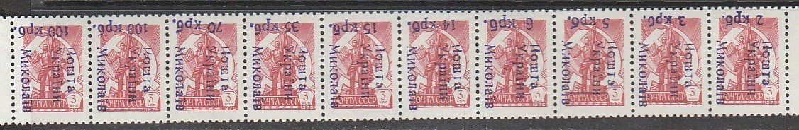 Украина 1993 год. Провизории. Николаев. Локальный выпуск, полоса из 10 марок (перевёртка) (III)