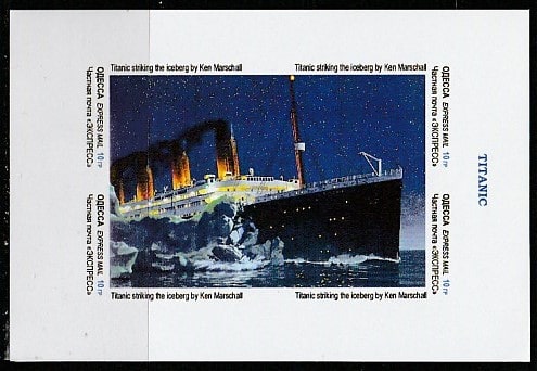 Украина (Одесса) "Титаник" на картине Кена Маршалла, б/зубц. квартблок марок экспресс-доставки.