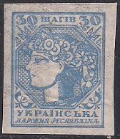 Украинская Народная Республика (УНР) 1919 год. Марка (номинал 30 шагов) без зубцов (наклейка)