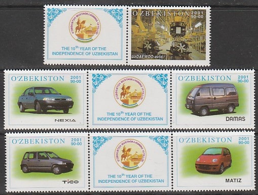 Узбекистан 2001 год. 10 лет Независимости. Автомобилестроение, 5 марок с купонами.