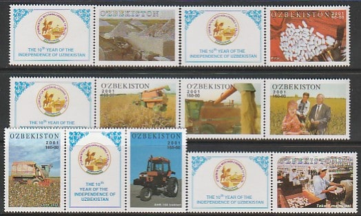 Узбекистан 2001 год. 10 лет Независимости. Сельскохозяйственная и текстильная промышленность, 8 марок с купонами.